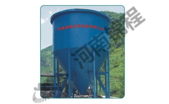 深錐濃縮機涉及有殼體、絮凝劑添加裝置、給料槽、穩(wěn)流圈、溢流槽、穩(wěn)流板、傾斜板、攪拌器、刮料器和排料裝置組成。所說的殼體是本實用新型所說的深錐濃縮機的主體支撐件,為上柱下錐的倒錐形結(jié)構(gòu)。在穩(wěn)流板的下面,即殼體的柱體部分的下部,錐形部分的上面設(shè)置有傾斜板。固體顆粒在沉降到傾斜板時,迅速沿傾斜板下滑,進入錐體部分。沉降路徑大大縮短,加快了沉降速度。使用本實用新型所述的深錐濃縮機,有效增大了沉降面積,加快了沉降速度,縮短了沉降時間,大大提高了生產(chǎn)效率。 SGN-3.5型深錐高效濃縮機(圖1)