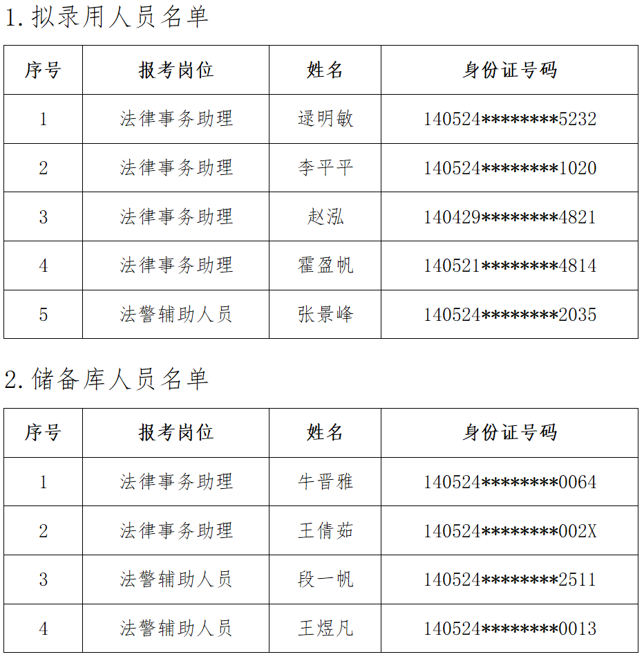 根據(jù)鑫富源人力資源公司2025年2月21日發(fā)布的《鑫富源公司2025年招聘司法輔助人員,派往陵川縣法院工作公告》要求,經(jīng)公開(kāi)報(bào)名、資格初審、初試、資格復(fù)審、面試、體檢、政治審查等環(huán)節(jié),現(xiàn)將符合錄用條件的人員公示如下: