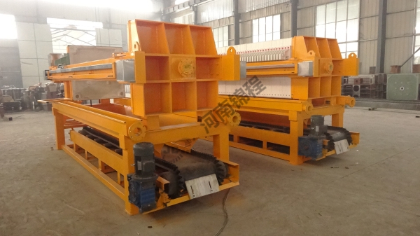 在液壓缸的作用下,壓濾機(jī)濾板沿主梁移動壓緊,使相鄰濾板間形成濾室,周邊密封。煤泥水經(jīng)人料泵以一定壓力從人料孔給人各濾室,借助人料泵的給料壓力在過濾介質(zhì)兩側(cè)形成的壓力差實現(xiàn)固液分離,煤泥顆粒滯留在濾室內(nèi),濾液透過過濾介質(zhì)從濾板的導(dǎo)水孔排出機(jī)外。經(jīng)過一段時間后,濾液不再流出,過濾脫水過程完成。停止入料,由鏈條拉開濾板,濾餅脫落后,由壓濾機(jī)下的刮板輸送機(jī)或膠帶機(jī)運走。